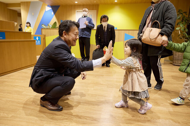 完成記念式典では市長自ら、招待された近隣の保育園・幼稚園の園児さん、小学生たちをハイタッチでお出迎え。