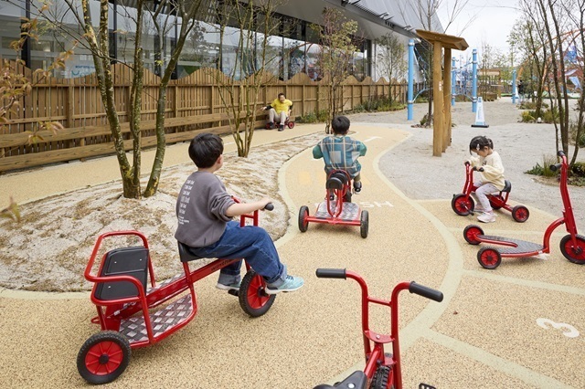 直線とカーブ、駐車スペースもばっちりな三輪車エリアでレッツドライブ♬