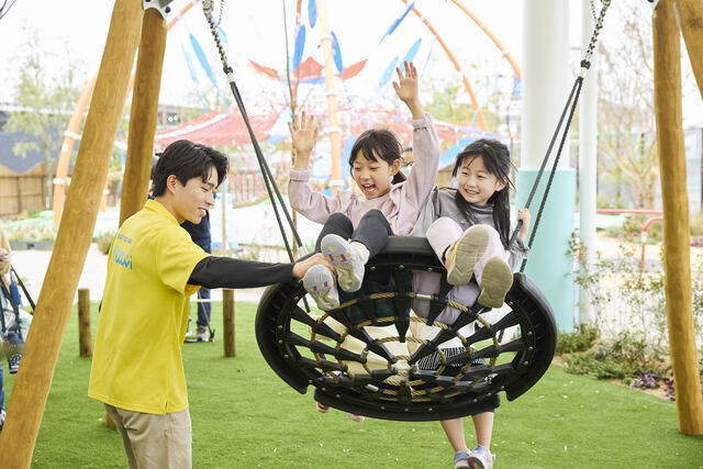 お姉さんは、プレイリーダーが安全に揺らしてくれた「バードネスト・スウィング」でEちゃんと一緒に大興奮!