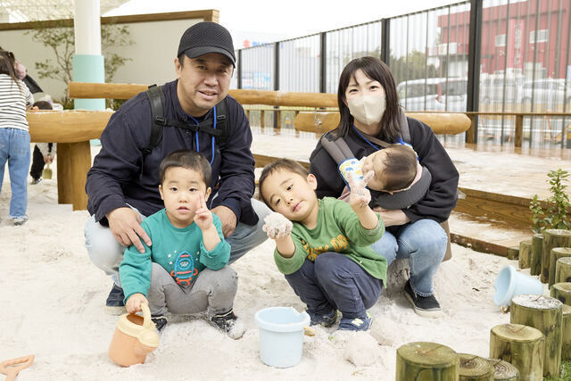 Iさんファミリー 雨の日にあそべるのはすごくいいですね、雨降りだと、こんな風に砂あそびできないですもんね。『こんなに砂好きだったんだ(笑)』というぐらい集中してあそんでてびっくり。うちは男の子なんで、あそびを通して体を鍛えられていいですね。家から近くなので、友達(家族)とここでばったり会うこともあって楽しそう(パパ)