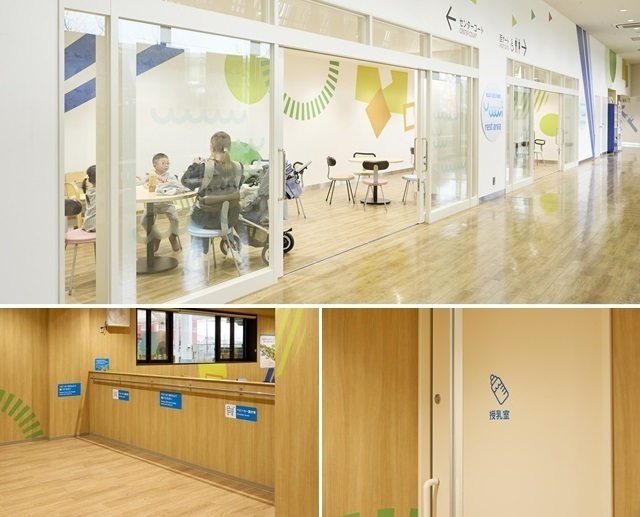 ご安心を!ゆったりとした休憩スペース(上)もあるし、ベビーカー置き場(左)もたっぷり、きれいで落ち着ける授乳室(右)も完備されていますよ~。