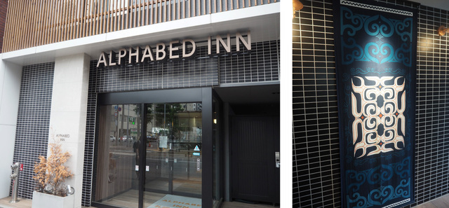 エントランスは、アイヌ模様のタペストリーと藍色のタイル壁が美しいスタイリッシュな空間です。