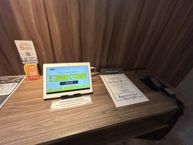 セルフチェックインなので、エントランスのカウンターにあるタブレット操作と本人確認だけでチェックイン手続きが完了します。チェックアウト時は、退出するだけで操作不要なんです。