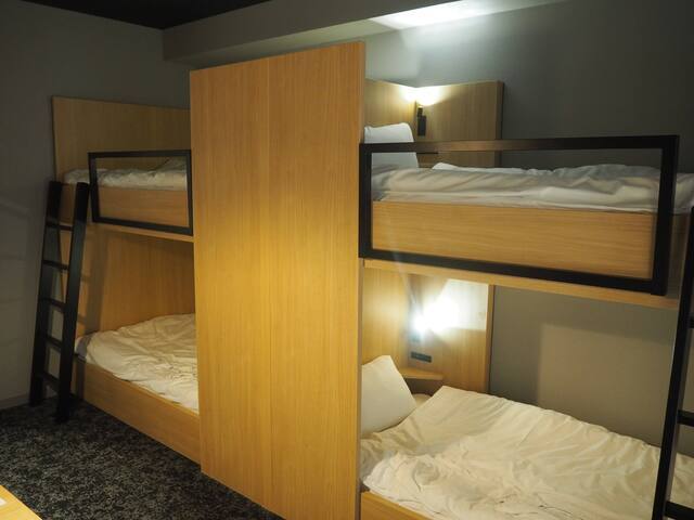 お部屋には、札幌市内のホテルではめずらしい2段ベッドが2台、そして幅2mのダブルベッドが1台用意されています。