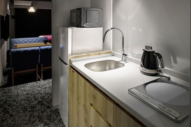 このお部屋にはミニキッチンがついているので、材料を準備すれば自炊も可能です。鍋などの調理器具から食器や一般的な調味料まで一通り揃っているのがうれしいところ。電子レンジや大きめの冷蔵庫もあるので、離乳食の温めや連泊中の食材保管にも便利です。