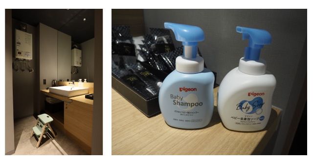 大人用のアメニティはもちろん、ベビー用シャンプー、ボディーソープも準備されていますよ。洗面所には踏み台もあるので、子どもがお家と同じように自分で身支度できそうですね。