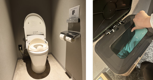 トイレには補助便座があります。また、紙おむつ専用のごみ箱も設置されているので、汚れた紙おむつの扱いにも困りません。