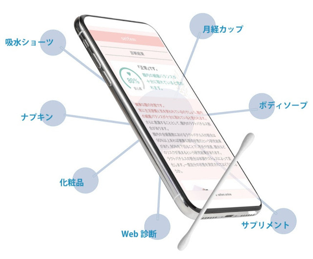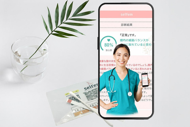セルフェムは女性が自分で採取したおりものから、付属の判定シートで膣内の状態を測定し5分で検査結果が分かります。その後、ウェブサイトの質問に答えると医師の診断チャートに基づき、6つのパターンから判定された結果が表示され、症状に合ったフェムケア商品をその場で購入することもできます。