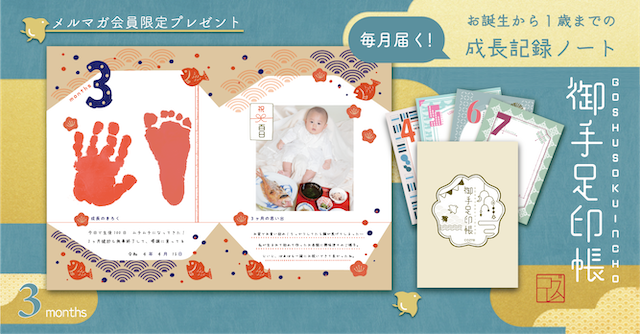 御手足印帳は、毎月のお子さんの手形足形を記録できる台紙のテンプレートです。生後0ヶ月から1歳になるまでの13ヶ月間、毎月台紙を集めてもらうと1冊の御手足印帳が完成します。メールマガジン「コズナビ」会員限定でゲットできます。