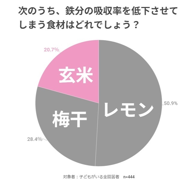 一番多かった回答はレモンでした。体に良いイメージのある玄米ですが、玄米に含まれる不溶性食物繊維が「鉄」も一緒に排泄させてしまい、「鉄」の吸収を阻害してしまうそうです。こちらは正答率が約20%でした。