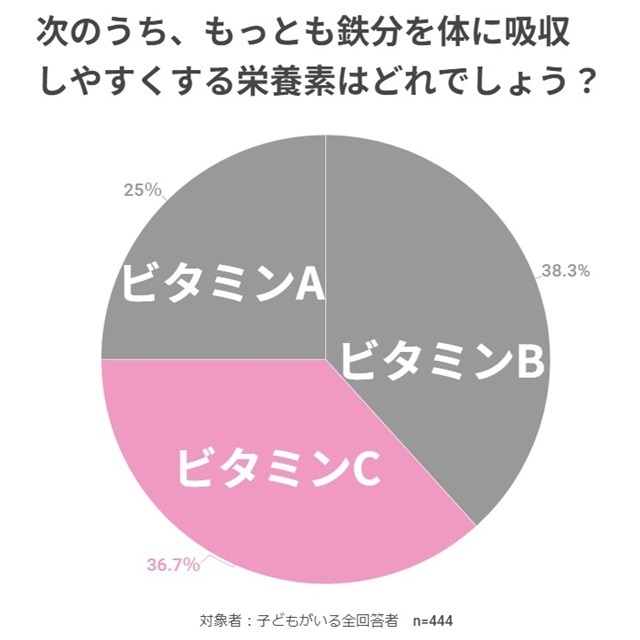 一番多かった回答はビタミンBでした。ビタミンCは、「鉄」と一緒に取ると吸収を良くしてくれる働きがあります。正答率は36.7%とまずまず?3つの選択肢の中でもビタミンBと迷う人が多かったようです。