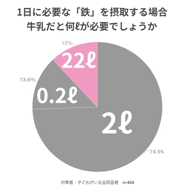 厚生労働省が発表、5年ごとに改訂されている「日本人の食事摂取基準」の最新版(2020年版)によれば、生後12~36ヶ月の子どもに推奨される1日の鉄の量を牛乳で取り入れる場合、なんと約22ℓです!