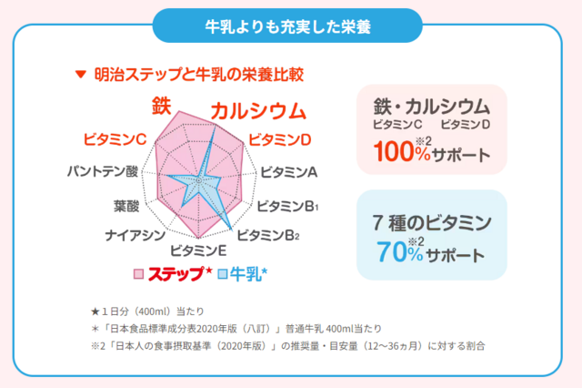 その他、7種のビタミンも必要量の70%サポート。離乳食だけではなかなか十分な栄養素を取れないもの。いつもの飲み物を『明治ステップ』に変えるだけで、子どもに欲しい栄養をしっかり補えるんです。