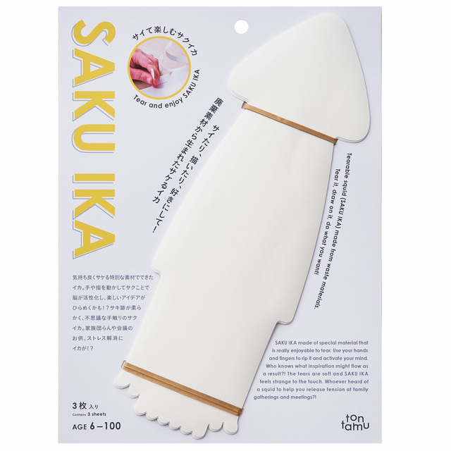 「サクイカ」は、とうもろこし澱粉由来の廃棄素材から作られた、イカ型のシートです。裂いたり、描いたりして遊べる特殊な素材で、ストレス解消や脳の活性化が期待できます。細く裂いてサキイカを作ったり、目や模様を描いて自分だけのサクイカを作ったり、ぐちゃぐちゃと丸めてスルメイカを作ったりと、さまざまな遊び方ができます。
