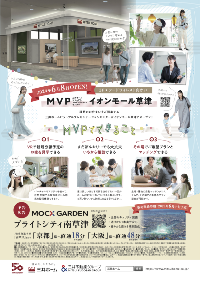 来店予約はこちらから!MOCX GARDEN ブライトシティ南草津【三井ホーム】の詳細はこちら ・掲載内容や連絡先等は、現在と異なる場合があります。・表示価格は、改正前の消費税率で掲載されている場合があります。ご了承ください。 関連記事 おうちCO-OPからの出産お祝い!「スマイルボックス」プレゼント! プレスリリース情報 PR 住宅情報館公式YouTubeチャンネルで、住まいの情報を配信中! プレスリリース情報 PR マストスクエア東山 建物内モデルルーム見学を受付中(愛知県) プレスリリース情報 PR 関連するキーワード