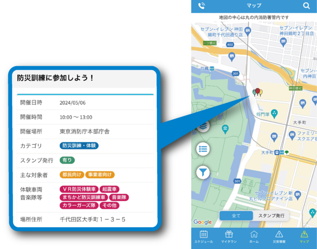 「いつ・どこで」防災訓練に参加できるのか、東京消防庁公式アプリのマップ機能で確認できます。