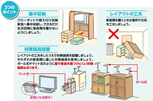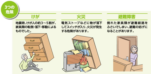 地震の揺れで転倒・落下・移動してくるものから身を守りましょう。