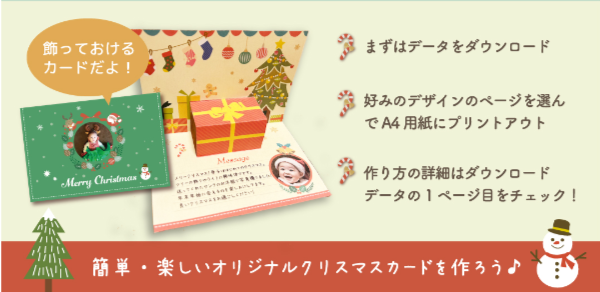 クリスマス用メッセージカードのテンプレ―トを73種類配布しています。立体型カードやしかけ付きカードなど、ちょっと変わったクリスマスカードのテンプレートもあります。
