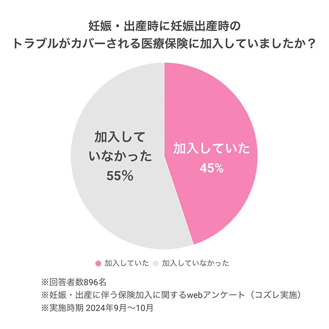 コズレ会員へのアンケートでも、妊娠・出産時に使える保険に加入していた人の割合は45%と実に4割を超える人が加入していました。