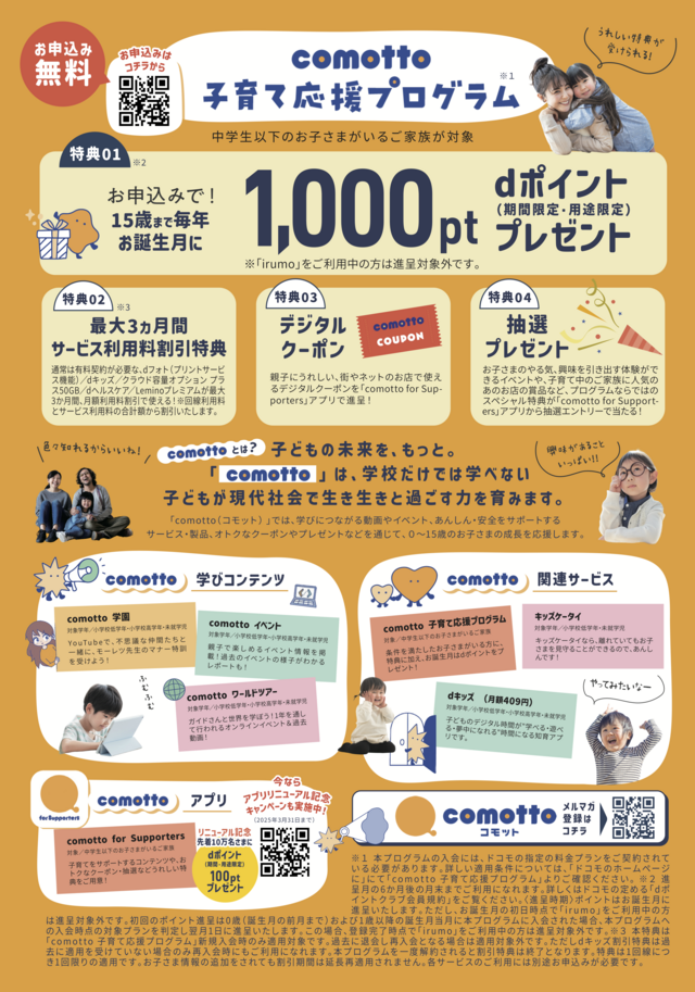 comotto 子育て応援プログラムの申し込みはこちらイマドコサーチ公式サイトcomottoのメルマガ登録はこちら ・掲載内容や連絡先等は、現在と異なる場合があります。・表示価格は、改正前の消費税率で掲載されている場合があります。ご了承ください。 関連記事 おうちCO-OPからの出産お祝い!「スマイルボックス」プレゼント! プレスリリース情報 PR 住宅情報館公式YouTubeチャンネルで、住まいの情報を配信中! プレスリリース情報 PR マストスクエア東山 建物内モデルルーム見学を受付中(愛知県) プレスリリース情報 PR 関連するキーワード