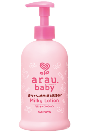 アラウ.ベビーミルキーローションは、赤ちゃんの皮脂バランスを考えて厳選配合した植物オイルを100%使用。のびが良く、べたつかないので季節を問わず新生児から使用できます。