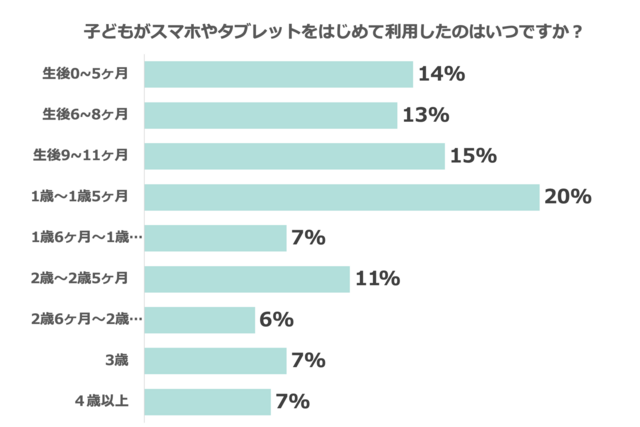 子どもがスマホやタブレットをはじめて利用した時期を聞いたところ、「1歳~1歳5ヶ月」が20%と最も多く、次いで「生後9~11ヶ月」が15%という結果でした。1歳前後で使いはじめるケースが多いようですね。