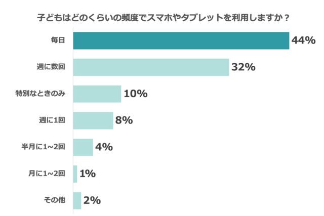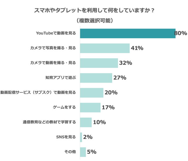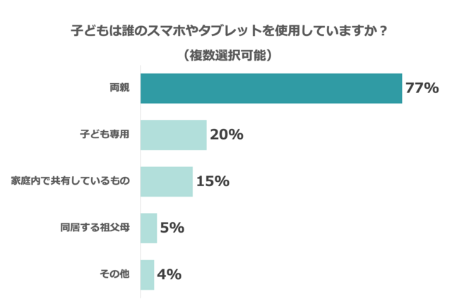 両親のスマホやタブレットを子どもが使っているご家庭が77%と最も多くはありますが、約20%の人が「子ども専用」のものと答えています。