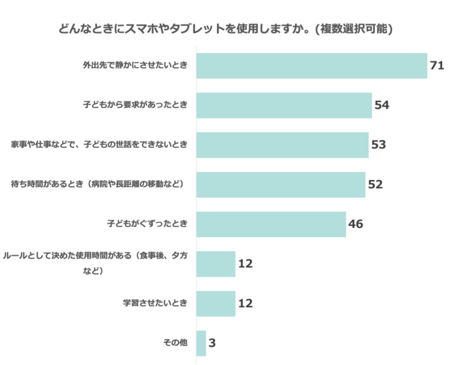 みなさんいろいろな場面で活用しているようですが、最も多い回答が「外出先で静かにさせたいとき」でした。公共の場などでは周囲に迷惑をかけないように配慮する目的で使用することが多くなるのかもしれないですね。