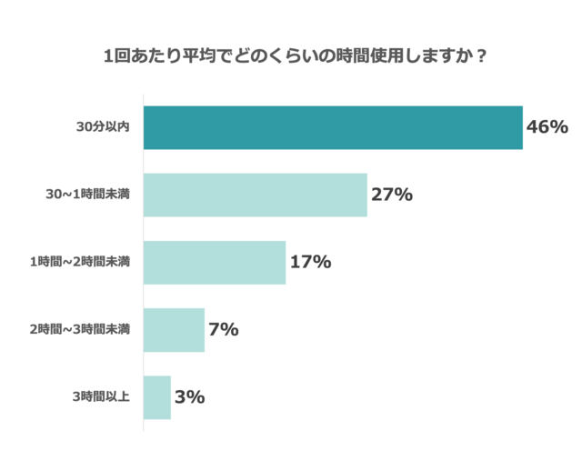1回あたりの平均使用時間は、 「30分以内」という回答が46%と最も多く、次いで「30分〜1時間未満」が約27%という結果でした。短時間で切り上げているご家庭が多いようですね。