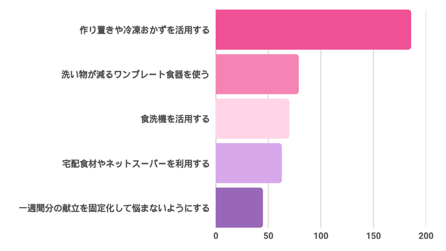 その他にも、朝に準備しておけば帰宅する頃に調理ができている電気圧力鍋の活用など、各家庭に合ったさまざまな時短テクがあるようです。