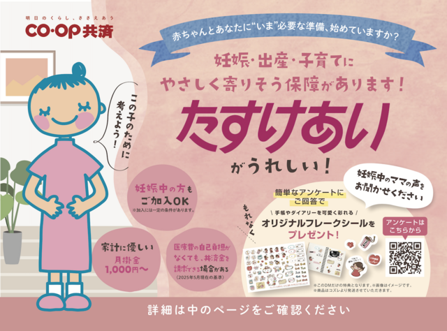 お子様の保障《たすけあい》ジュニアコースはこちらお誕生前に申し込める《たすけあい》1000円コースはこちら妊娠中でも加入できる《たすけあい》大人向けコース(女性)はこちらCO・OP共済《たすけあい》 ポータルサイトはこちら ・掲載内容や連絡先等は、現在と異なる場合があります。・表示価格は、改正前の消費税率で掲載されている場合があります。ご了承ください。 関連記事 夢中になれる学びを!Z会幼児コース年中・年長おためし教材無料体験キャンペーン プレスリリース情報 PR 子ども向け体操教室「LUNA STUDIO」で新コースがスタート! プレスリリース情報 PR 子どもと一緒に遊んで学ぼう!茨城県の社会科見学スポット3選 madomado 関連するキーワード