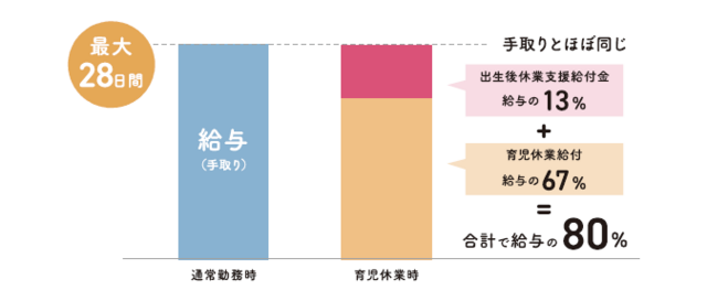 育休中は給与が支給されないのが一般的ですが、「育児休業給付」により、休業前の給与の67%(手取り8割)相当が支給されます。