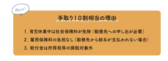 出典:www.mhlw.go.jp育休取得前は、給与から所得税や社会保険料などを控除された額が手取りとして支払われます。ですが、育休期間中は、社会保険料や雇用保険料は免除されますし、給付金は課税対象外です。その結果、手取りが育休前のほぼ10割になるように設計されているんです。