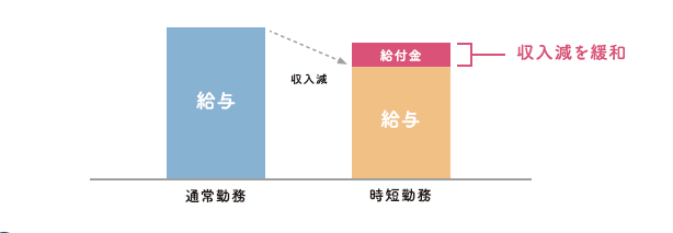 この制度は、時短勤務中の給与の原則10%が給付される制度です。時短勤務で減る収入を補助することで、時短勤務を利用しやすくする狙いがあります。