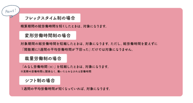 フレックスタイム制やシフト制といったさまざまな形の労働スタイルにも対応しており、あらかじめ決まっている労働時間を短縮すれば、対象になります。