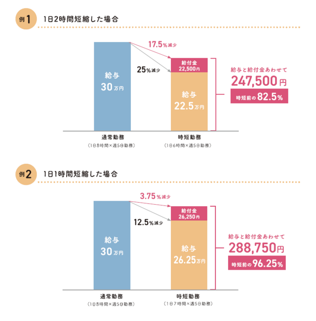 この制度を利用する際は、1人で1日2時間短縮した場合、給与と給付金と合わせた収入が時短前の82.5%(17.5%減少)になりますが、1日1時間短縮した場合、時短前の96.25%(3.75%減少)になります。