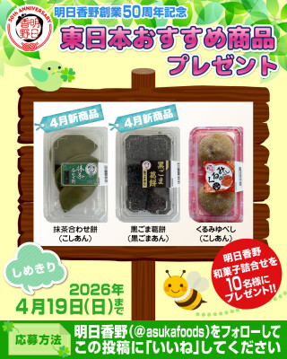 このたび、4月から東日本エリアで販売を開始する商品を含む「和菓子の詰め合わせ」がもらえるキャンペーン「東日本おすすめ商品プレゼント」を開始しました。キャンペーンの開催期間は2026年4月6日から4月19日までとなります。