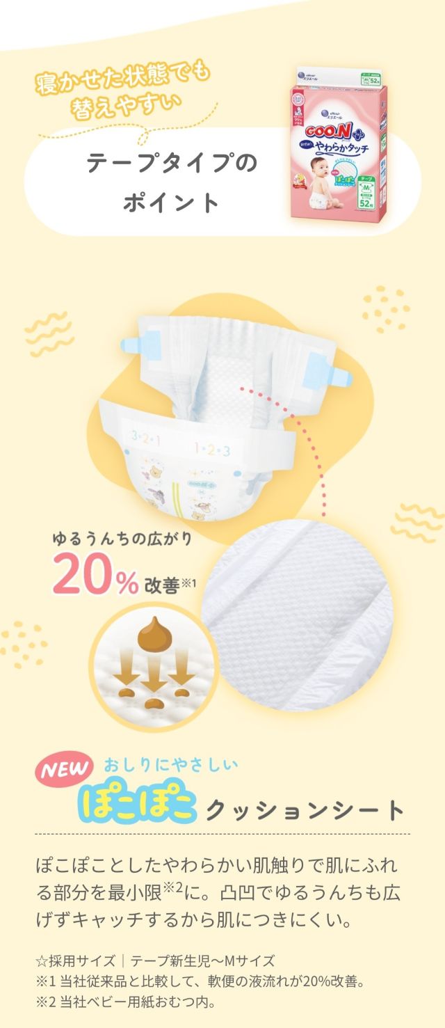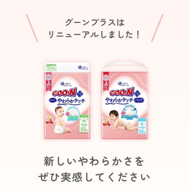 グーンプラス やわらかタッチは、デリケートな赤ちゃんの肌をやさしく包み込む紙おむつです。