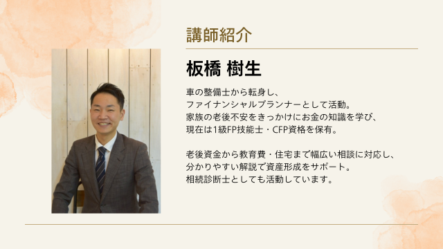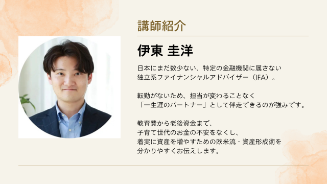 本セミナーは、子育て世帯のお金の悩みに精通したお金の専門家が担当します。