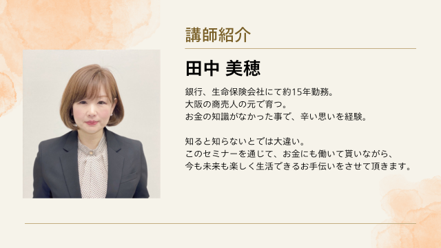知ると知らないとでは大違い。このセミナーを通じて、お金にも働いて貰いながら、今も未来も楽しく生活できるお手伝いをさせて頂きます。